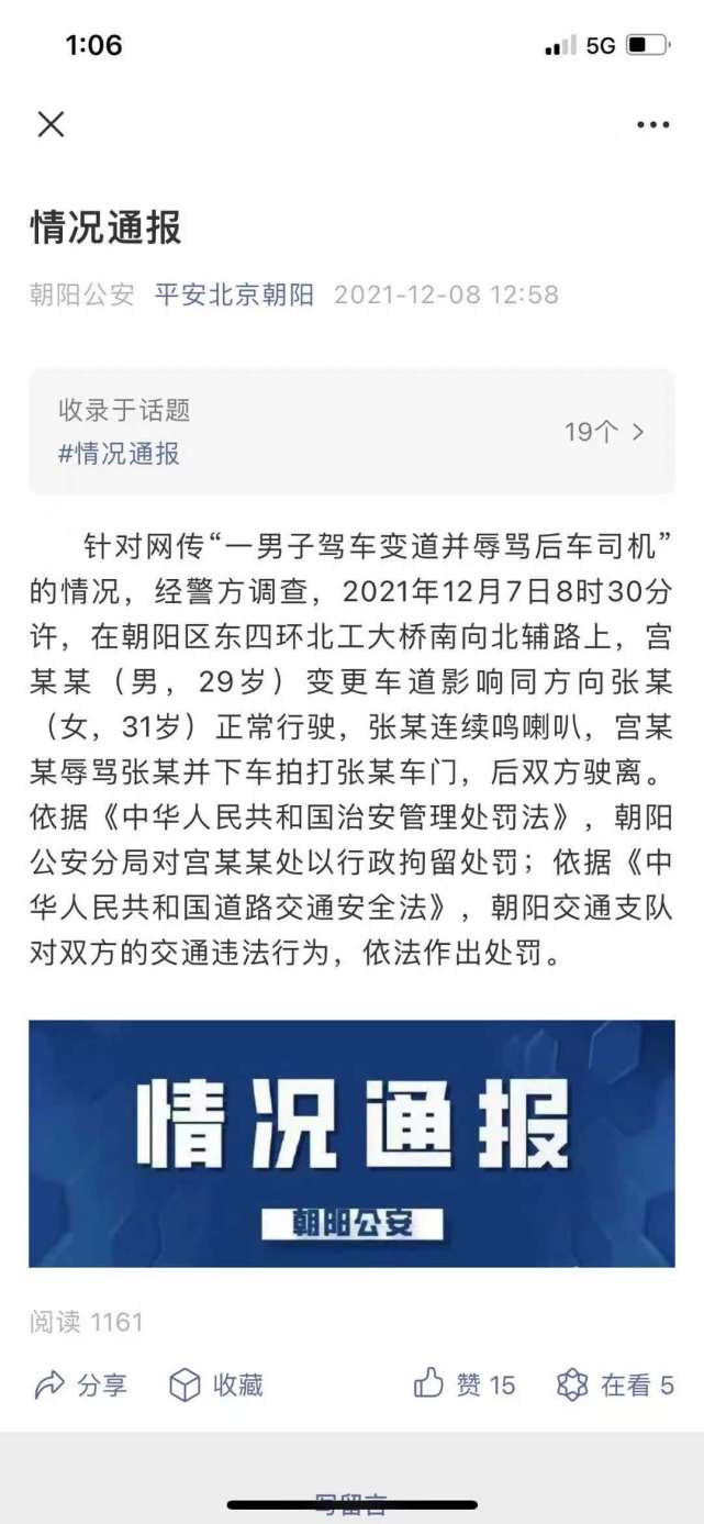 据北京市公安局朝阳分局12月8日通报,针对网传“一男子驾车变道并辱骂后车司机”的情况,经警方调查,2021年12月7日8时30分许,在朝阳区东四环北工大桥南向北辅路上,宫某某(男,29岁)变更车道影响同方向张某(女,31岁)正常行驶,张某连续鸣喇叭,宫某某辱骂张某并下车拍打张某车门,后双方驶离。依据《中华人民共和国治安管理处罚法》,朝阳公安分局对宫某某处以行政拘留处罚;依据《中华人民共和国道路交通安全法》,朝阳交通支队对双方的交通违法行为,依法作出处罚。