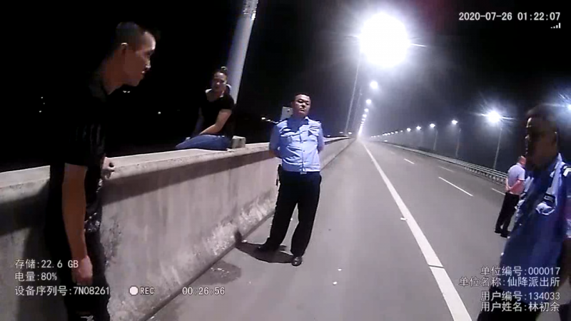 7月26日凌晨42分许,瑞安市公安局仙降派出所接到110指令称,飞云江六桥上有一女子坐在桥墩上想自杀。情况紧急,民警朱旭曦、林初余等人火速赶往现场。