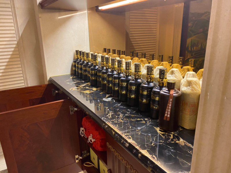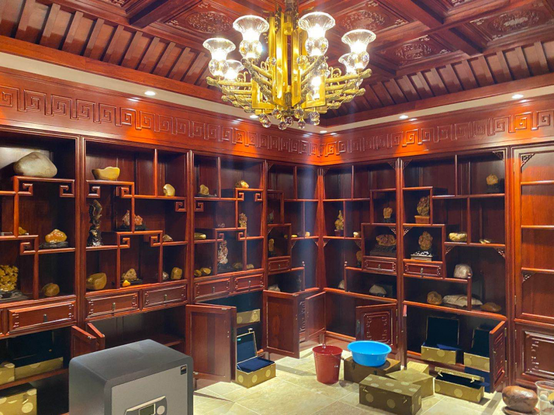 记者注意到,这栋别墅包括地上的四层和地下一层,共五层。地下一层的大部分空间被用作陈列区,存放着几十件玉石工艺品以及几十瓶茅台酒。地下还包括一间可供五人共同观影的家庭影院和一间独立衣帽间。执行干警在查验之后将房屋封存,等待腾退。