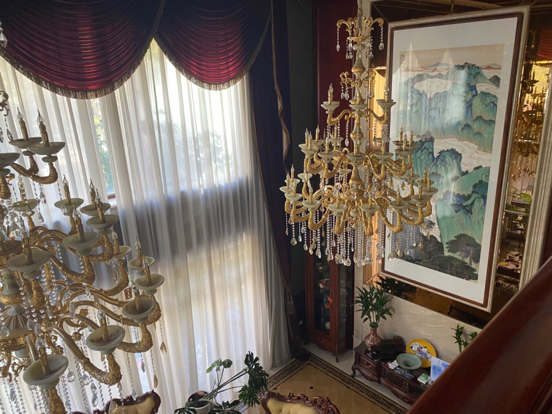 别墅一至三楼装修整体呈欧式风格,一楼包括客厅与餐厅,客厅挑高至二层,悬挂着两盏大型欧式吊灯,墙上挂着一副高约5米的山水画,餐厅装饰也极尽奢华,花草石雕字画遍布。二楼为汪某、严某夫妇及其孩子的起居室,客厅还摆放着一架钢琴。三楼主要作为瑜伽室以及化妆间使用,拐角处有一个书房,阳台能够俯瞰湖景。四楼为阁楼,主要是存放汪某小儿子的玩具,以及一些乐器,同时还专门设置了一个陈列室,摆放着汪某孩子们的学校合影及奖状。