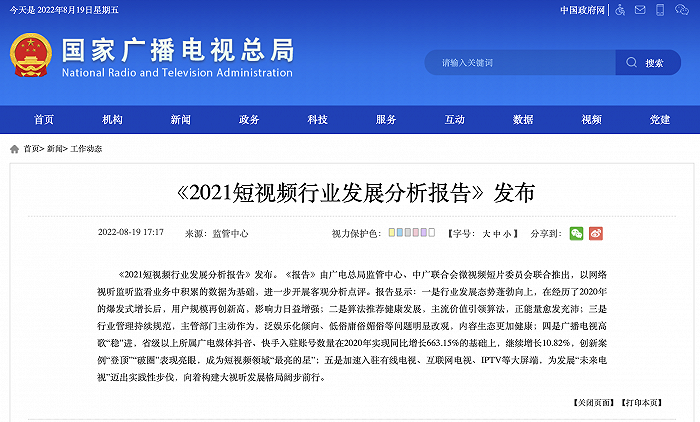 据国家广播电视总局网站消息,《2021短视频行业发展分析报告》发布。《报告》由广电总局监管中心、中广联合会微视频短片委员会联合推出,以网络视听监听监看业务中积累的数据为基础,进一步开展客观分析点评。