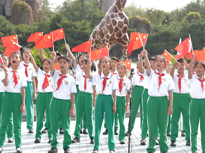 10月1日早上,北京野生动物园的步行区迎宾湖广场上,来自海淀区五一小学大兴一分校和大兴区滨河小学的同学们手执国旗,深情演唱《歌唱祖国》《没有共产党就没有新中国》《今天是你的生日,中国》等经典曲目,吸引众多游客驻足、倾听、合唱。