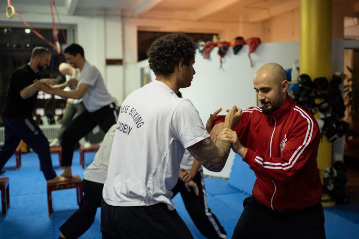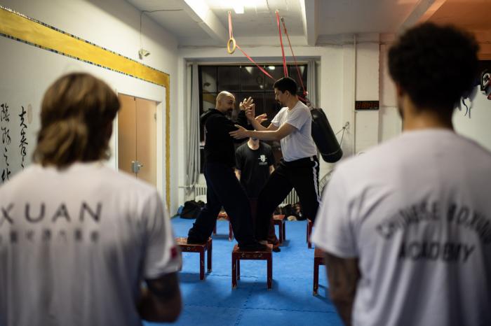 游理汉让德国人更深入理解中国武术,佘予然则让中国年轻人走近德国剑术。跨越欧亚大陆,他们都在以自己的方式,让武术成为跨越文化的桥梁。11月13日,学员在德国柏林“玄”武术馆练习推手。新华社记者 张豪夫 摄