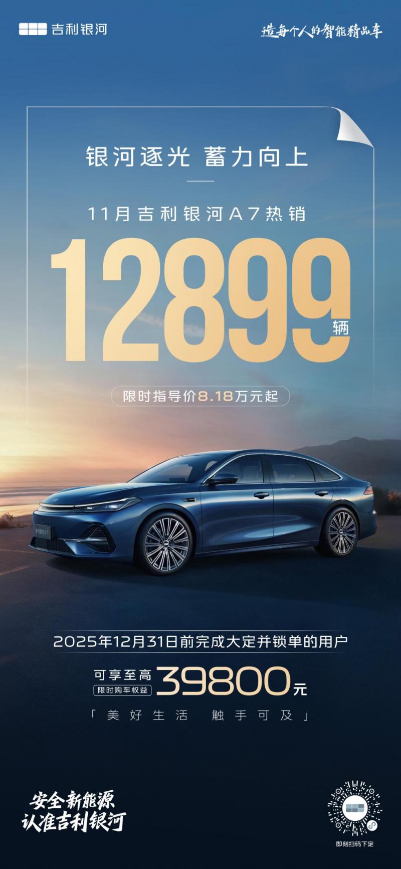 在连续四个月销量破万之际,为回馈市场厚爱,吉利银河A7特别推出12月专属福利,在2025年12月31日前完成大定并锁单的用户,可享至高39800元限时购车权益。其中,包括了8000元家享超级置换金优惠、免费享价值8800元16扬Flyme Sound无界之声、免费享2000-5000元升舱权益、免费享价值7500元5年高速高架NOA和城市通勤NOA(OTA)功能服务、8万24期0息或5年贷2年0息金融方案、车联网服务流量、赠送价值3990元充电桩及安装服务、享受三电终身质保以及整车6年或15万公里质保、赠送价值298元TPE原厂脚垫和价值598元原厂行车记录仪等多重好礼。