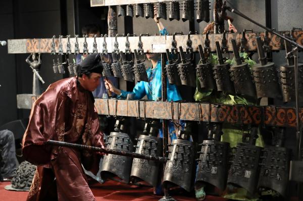 2月18日,在日本东京,演员在东京塔内的活动现场演奏编钟,为中国抗击疫情助威加油。
