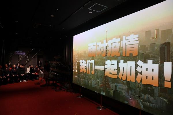 2月18日,在日本东京,东京塔内的大屏幕上播放支持中国抗击疫情的视频。