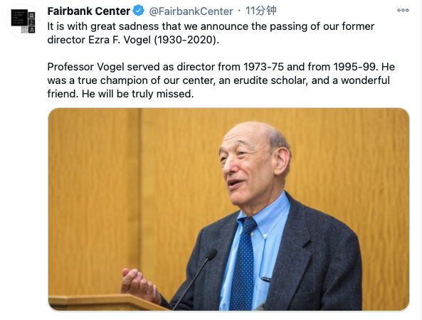 消息表示:“我们怀着悲痛的心情宣布前主任傅高义去世。在1973-1975年和1995-1999年期间,傅高义教授担任中心主任。他是我们中心真正的守护者,一位博学的学者,一位很好的朋友,我们将深刻怀念他。”