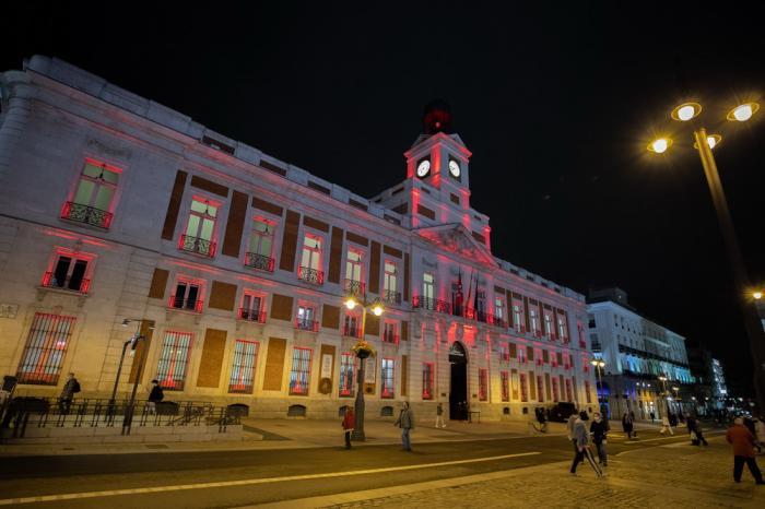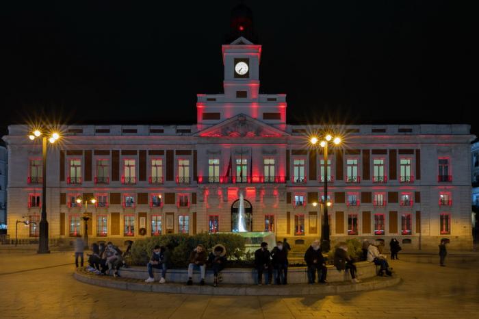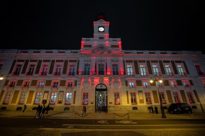2月11日在西班牙马德里太阳门广场拍摄的皇家邮局。当日,西班牙马德里太阳门广场的皇家邮局点亮“中国红”,庆祝中国农历新年。