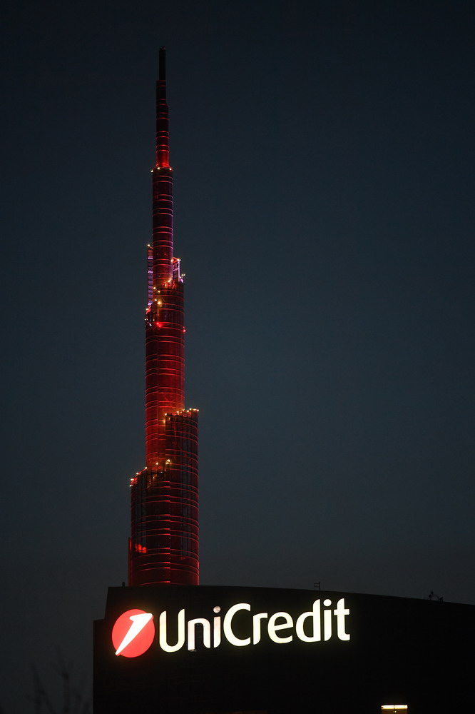 2月11日在意大利米兰拍摄的裕信银行塔。为庆祝中国春节,意大利米兰地标性建筑裕信银行塔的塔顶当日点亮“中国红”。