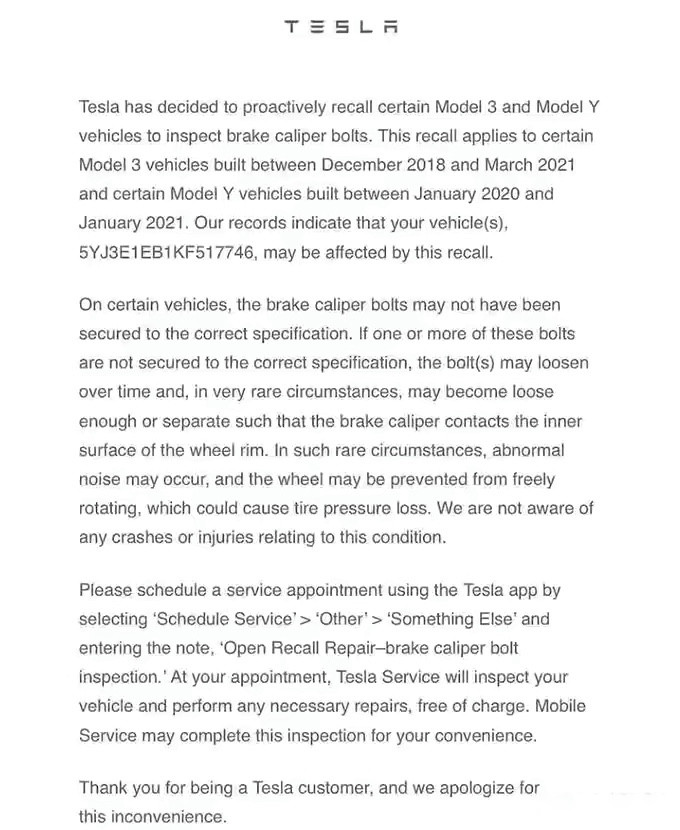 特斯拉表示,目前这个缺陷从未导致任何一起车辆刹车失灵问题,并且也没收到任何因此情况导致的碰撞或受伤案例,并且中国制造的Model3和ModelY车型均不存在此类问题。