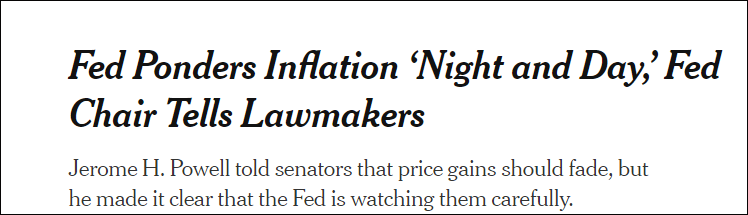 也是在这一天,鲍威尔结束了他在国会为期两天的参议院银行业委员会半年度听证会。鲍威尔在会上表示,他对近期美国的通胀率感到担忧,“系统经受的这个冲击与经济重启有关,使通胀率升幅远超2%,我们当然对此感到不安”。