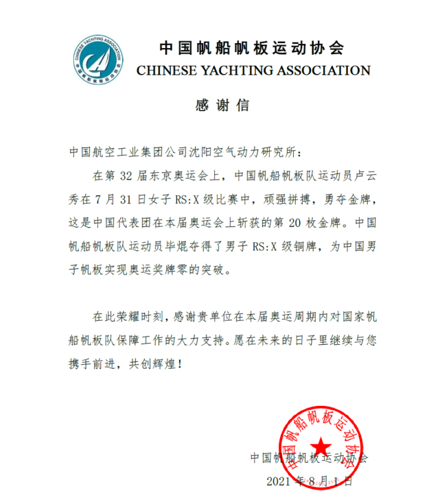 8月1日,中国帆船帆板运动协会向航空工业气动院发来感谢信,特地感谢气动院为国家帆船帆板队保障工作的大力支持。