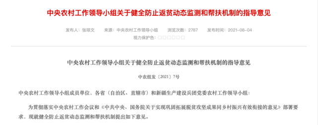 政知君注意到,今年5月,《中央农村工作领导小组关于健全防止返贫动态监测和帮扶机制的指导意见》对外发布。