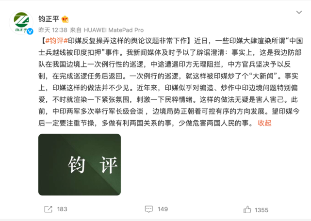 10月10日,解放军媒体官方微博账号“钧正平工作室”发文称:印媒反复操弄这样的舆论议题非常下作。