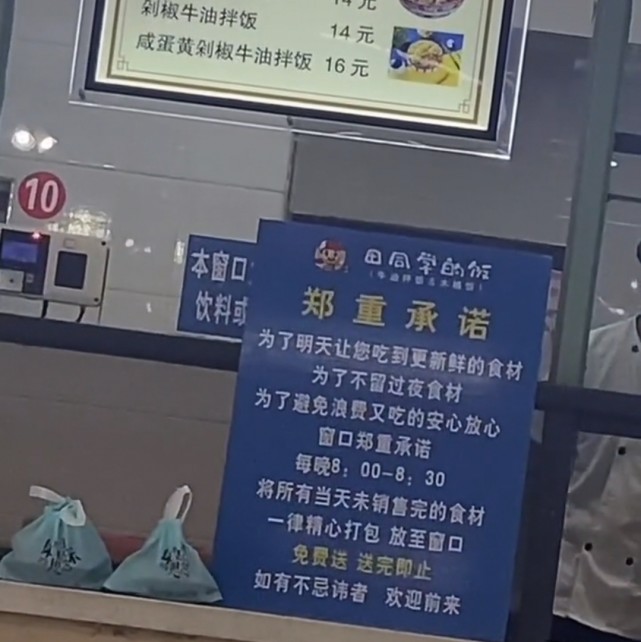 北青-北京头条记者注意到,一段学校食堂免费将未卖出的餐食免费发放给学生的视频在网上热传。视频中学校食堂一档口摆出公告牌,牌上写着“为了明天让您吃到更新鲜的食材,为了避免浪费又吃得安心放心,窗口郑重承诺,每晚8:00-8:30将所有当天未销售完的食材一律精心打包,放置窗口免费送。”