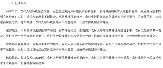 三年行动方案提到,到2020年,实现农村人居环境“明显改善”;五年行动方案要求,到2025年,农村人居环境“显著改善”。