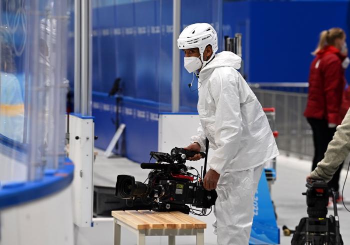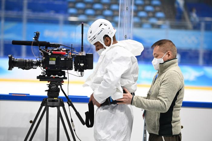 与场馆其他摄像、摄影师不同,穆加拉在工作时还需要带上一双冰鞋,负责在比赛开始前和结束后进入场地,在冰面上进行跟随拍摄,为电视观众呈现“零距离”观看运动员的画面。