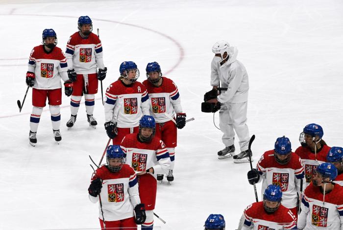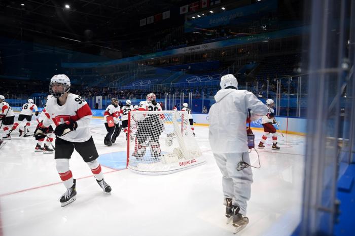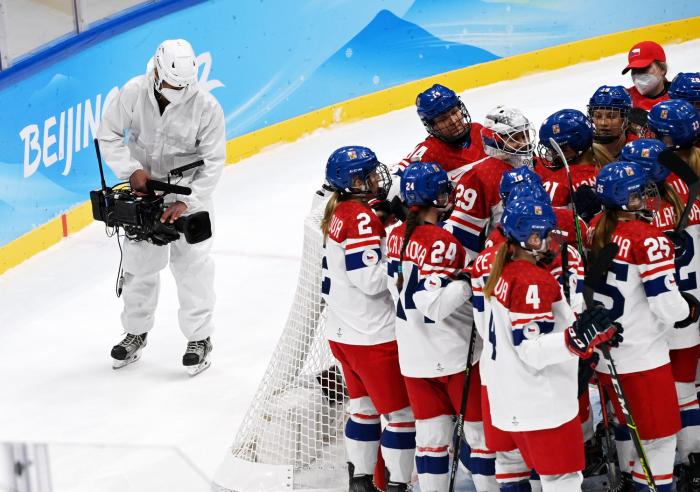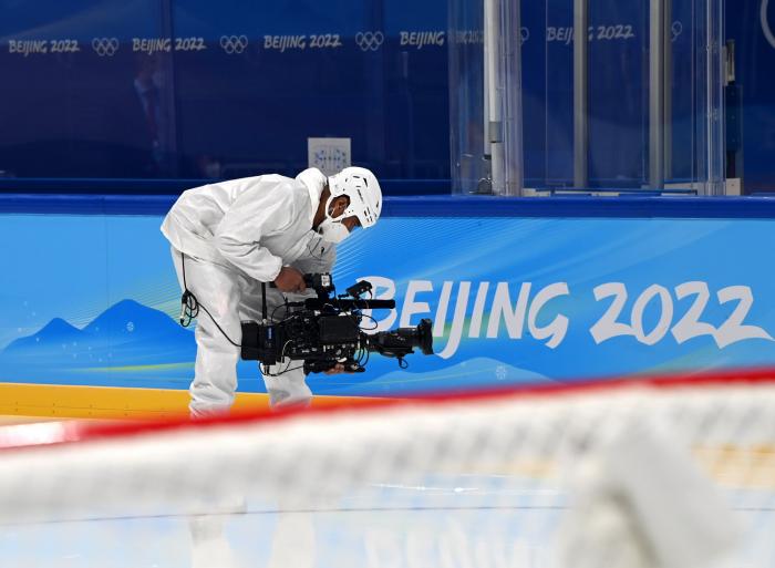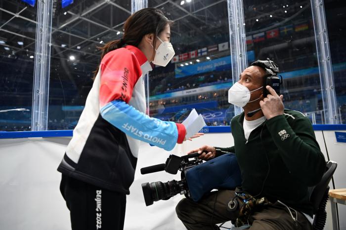 布伦南·穆加拉是北京冬奥会期间奥林匹克转播服务公司驻国家体育馆冰球项目的一名内场摄像师。这是2月8日,穆加拉(右)与场馆摄影副经理陈颖交流。