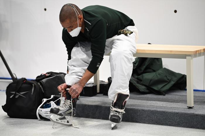 穆加拉本身也是一名冰球运动爱好者,并接受过系统性的训练。“作为冰面摄像师,除了专业的拍摄技能,还要具备较强的滑行技巧,拍摄以不影响运动员为前提。”