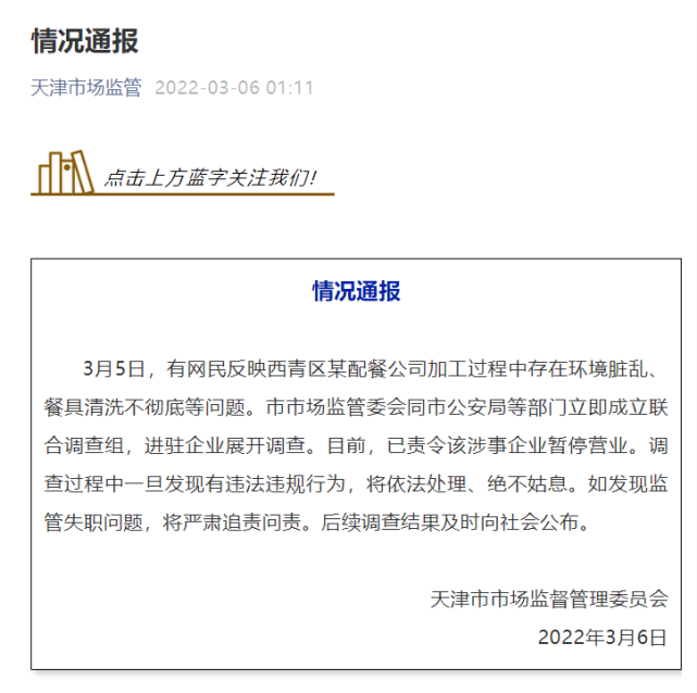 3月6日,天津市市场监督管理委员会发布情况通报。通报中称,天津市市场监管委会同市公安局等部门成立联合调查组,进驻某配餐公司展开调查。目前,已责令该涉事企业暂停营业。