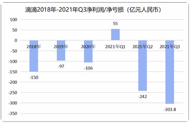 根据滴滴2021年底披露的2021年第二季度和第三季度未经审计的财报数据显示,滴滴的净亏损由2021年Q2的242.71亿元增加到Q3的303.75亿元。滴滴2021年Q3总营收为426.75亿元,环比下降11.48%。其中,中国出行部门营收为390亿元,环比下降19%。