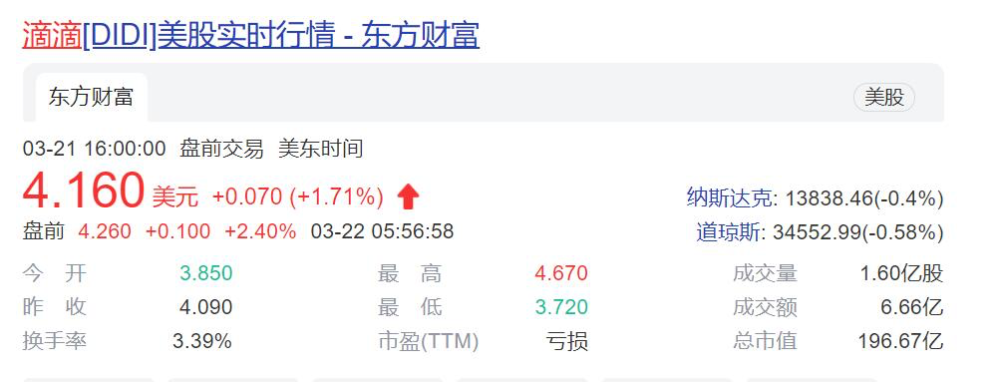 此外,根据过往资料显示,滴滴在美国上市后,盘中曾创下过18美元的高价。然而,如今滴滴股价跌至4.16美元,市值从上市之初的678亿美元缩减至目前的196亿美元,缩水幅度超三分之二。