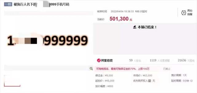 尾号“999999”手机号成爆款,法院拍出50.13万元高价