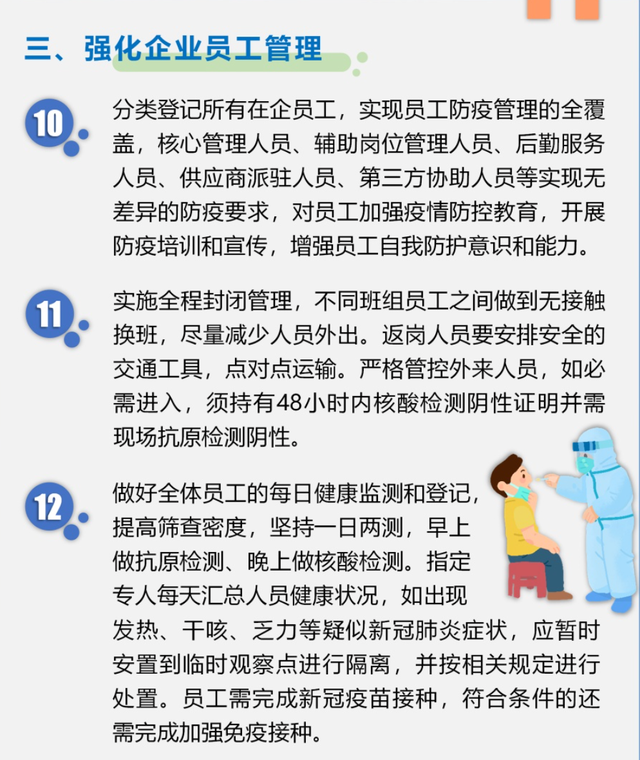 上述指引要求,企业做好全体员工的每日健康监测和登记,坚持一日两测,早上做抗原检测,晚上做核酸检测。