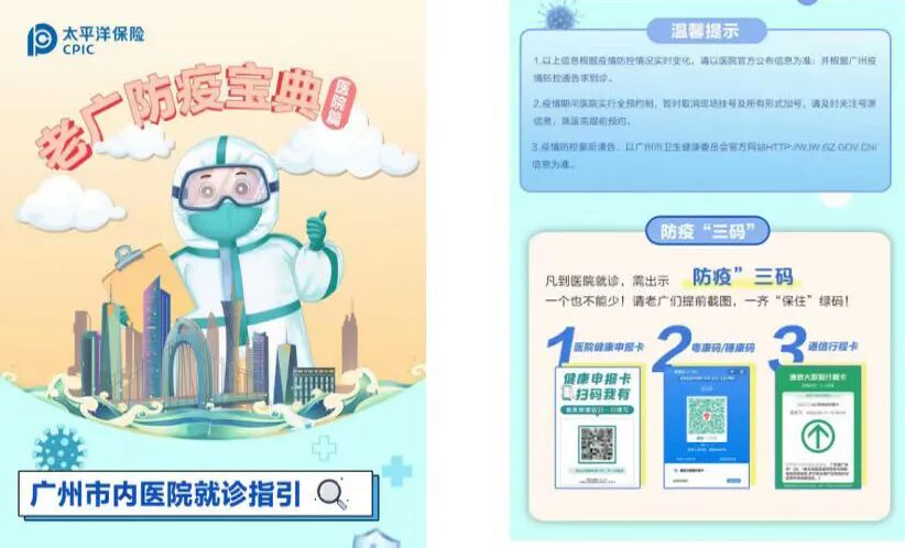 太平洋健康险广东分公司三医创新团队充分发挥专业特长,设计制作“老广防疫宝典”系列专题海报手册,全方位覆盖疫情期间市民医院就诊查询、黄码指引、在线问诊及购药咨询、特殊关爱人群防护资讯等医疗服务需求。