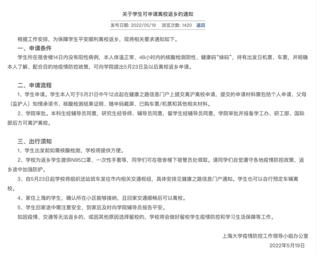 5月19日,上海大学发布了《关于学生可申请离校返乡的通知》,明确学生所在宿舍楼14日内没有阳性病例,本人体温正常、48小时内的核酸检测阴性、健康码“绿码”,持有出发日机票、车票,并明确本人了解、配合目的地疫情防控政策,可向学院提出5月23日及以后离校返乡申请。