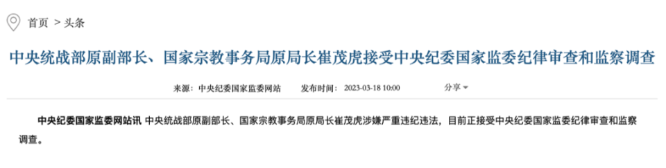 3月18日,中央统战部原副部长、国家宗教事务局原局长崔茂虎被查。