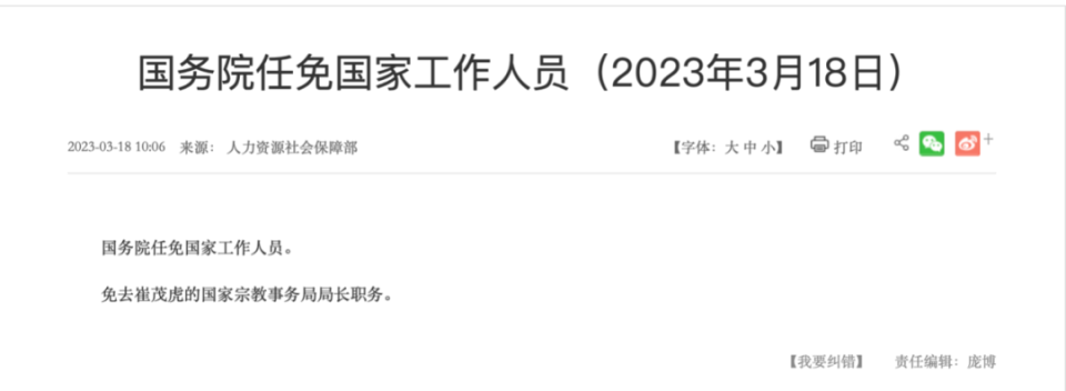 在官方宣布崔茂虎被查之后不久,人社部发布消息,国务院任免国家工作人员。免去崔茂虎的国家宗教事务局局长职务。