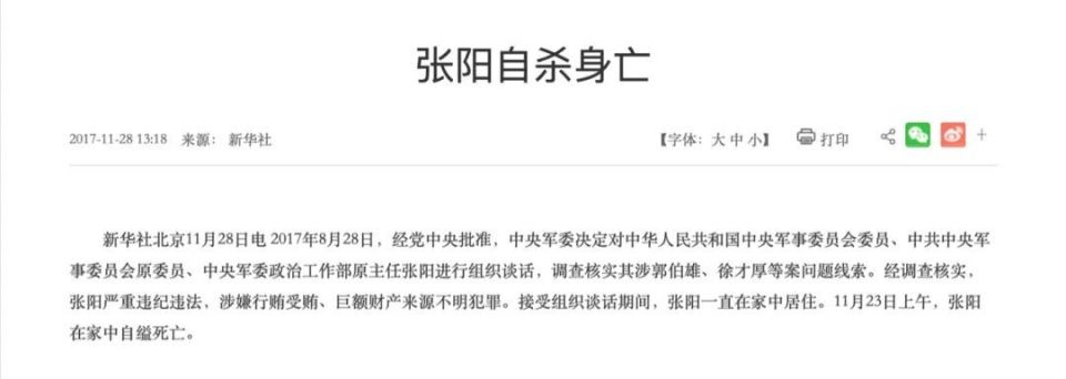 张阳,曾任中央军委政治工作部主任,涉嫌行贿受贿、巨额财产来源不明犯罪。2017年11月23日上午,张阳在家中自缢死亡。
