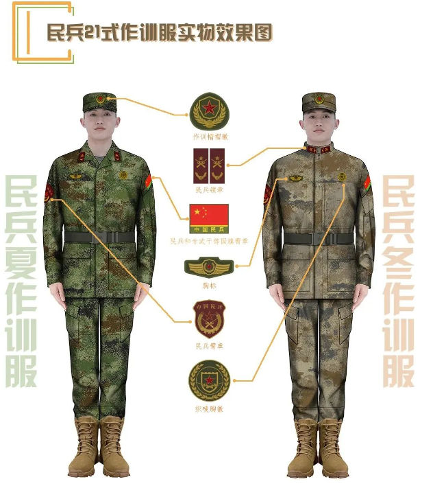 中国国防报报道披露,21式作训服配发对象为已编组注册的基干民兵和按规定选拔任命的专武干部。配发品种主要是丛林迷彩夏作训服、荒漠迷彩冬作训服、荒漠迷彩作训大衣和配套的标志服饰。