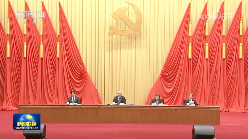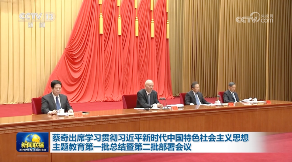 《新闻联播》画面显示,中共中央政治局常委、中央学习贯彻习近平新时代中国特色社会主义思想主题教育领导小组组长蔡奇出席会议并讲话。