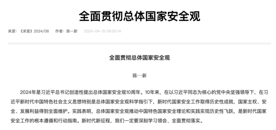 4月15日,2024年第8期《求是》杂志刊发了国家安全部党委书记、部长陈一新署名文章,文章的标题是《全面贯彻总体国家安全观》。