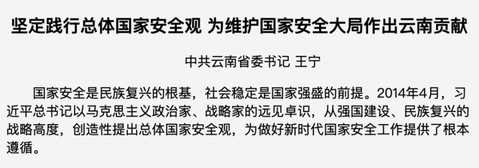 4月15日,云南省委书记王宁刊发了题为《坚定践行总体国家安全观 为维护国家安全大局作出云南贡献》文章。