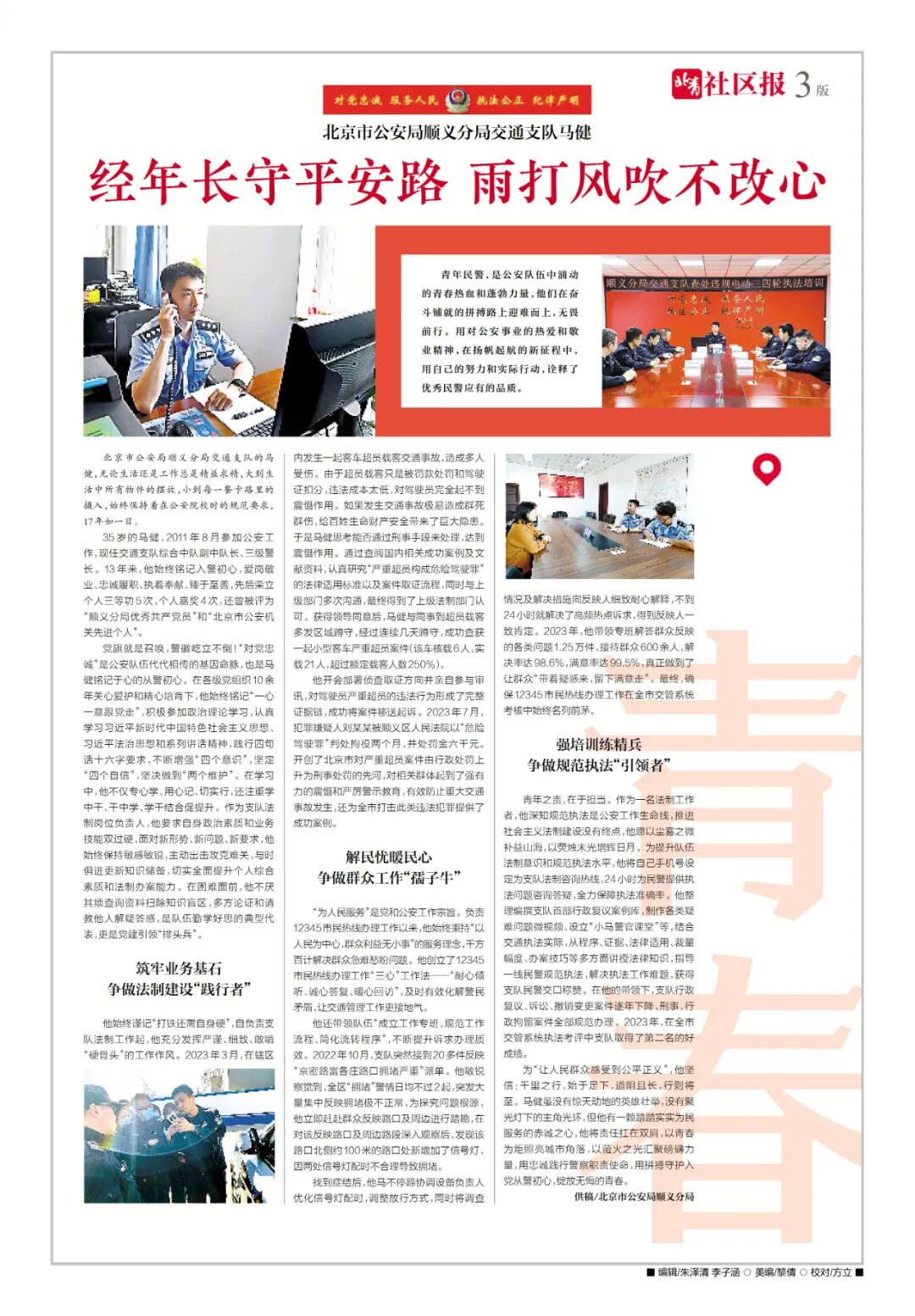 35岁的马健,2011年8月参加公安工作,现任交通支队综合中队副中队长、三级警长。13年来,他始终铭记入警初心,爱岗敬业、忠诚履职、执着奉献、臻于至善,先后荣立个人三等功5次,个人嘉奖4次,还曾被评为“顺义分局优秀共产党员”和“北京市公安机关先进个人”。