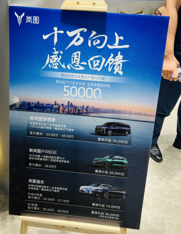 岚图汽车也针对旗下的全系车型推出了置换补贴,其力度空前。例如,如消费者购买岚图追光的EV版车型,最高可以享受5万元的置换补贴。