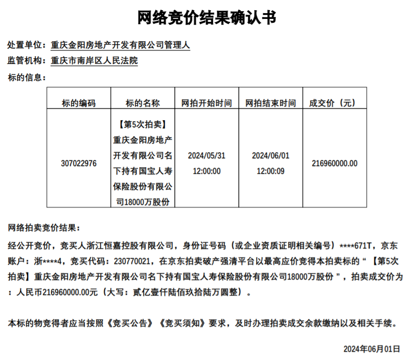 2023年7月以来 ,原位列第六的股东重庆金阳房地产开发有限公司,曾5次将所持有的1.8亿国宝人寿股份上挂京东司法拍卖平台,但前4次均因无人出价而流拍。直到在今年6月1日结束的第5次拍卖上,浙江恒嘉控股有限公司才以21696万的起拍价格拍下。