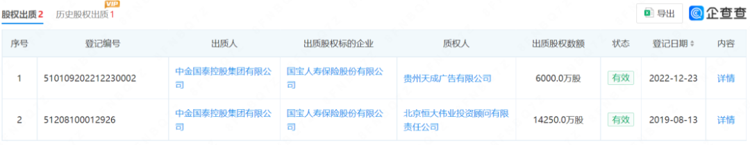 虽然拍卖公告并未透露拍卖原因,但企查查信息显示,中金国泰控股集团有限公司,也就是梦澄运合名称变更前,曾两次将国宝人寿股权出质。最近一笔发生在2022年12月,出质股权数额为6000万股,质权人为贵州天成广告有限公司。