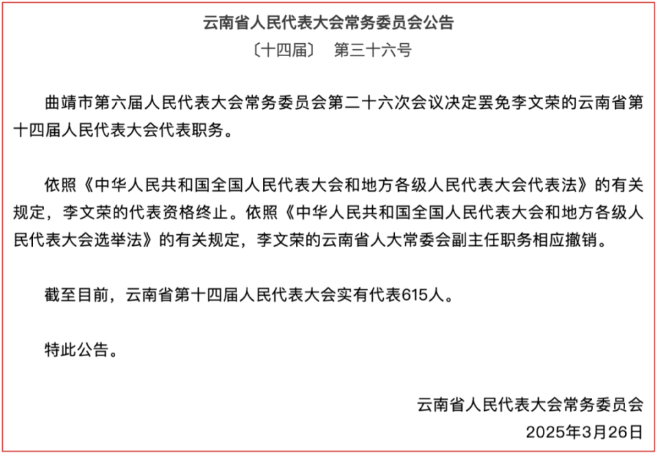 3月26日,云南省人民代表大会常务委员会公告:曲靖市第六届人民代表大会常务委员会第二十六次会议决定罢免李文荣的云南省第十四届人民代表大会代表职务。