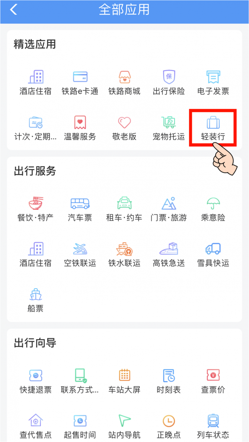 第一步:打开铁路12306App或者微信小程序,在首页中部应用处往左滑,找到“全部应用”,点击进入后找到【轻装行】模块。