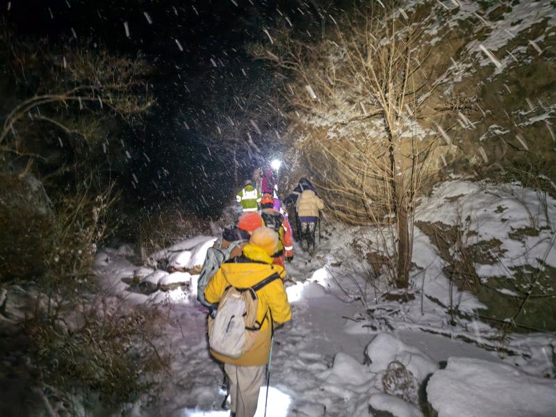 上山过程中,消防救援人员背负着数十公斤重的绳索、救援担架和应急食品等物资,深一脚浅一脚地在雪地里艰难跋涉。1月18日凌晨2时许,救援队伍行进至距被困人员四分之一路程处时,遭遇极端路况:山脊道路陡峭险峻,两侧皆是悬崖,而被困夫妻所在位置恰好在山谷部位,队伍无法继续安全通行。危急关头,现场指挥员当机立断,将队伍分为两组:一组前突搜救侦查,迎难而上继续向被困人员方向搜索前进;另一组10人原地待命,作为中途集结点,等待后方救援物资到来后再继续行动。