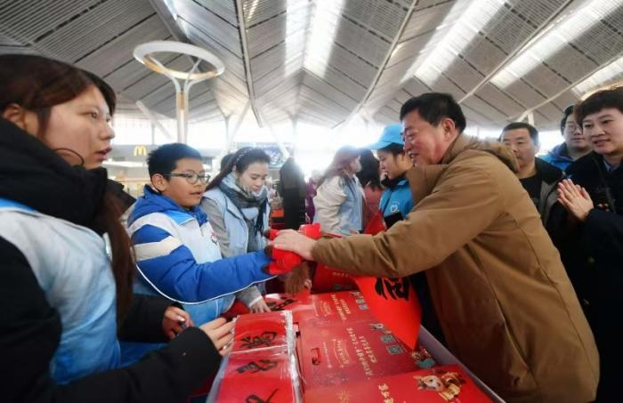 志愿者向旅客赠送纪念品。
