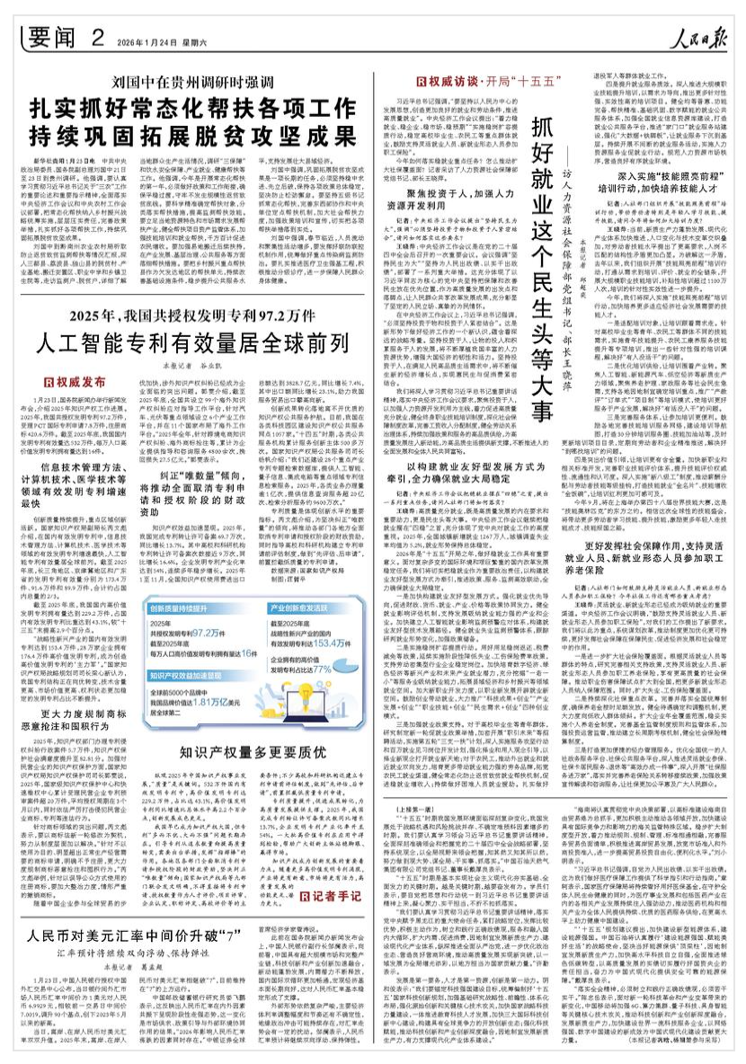 1月24日,《人民日报》第2版刊发《抓好就业这个民生头等大事》,权威访谈人力资源社会保障部党组书记、部长王晓萍。