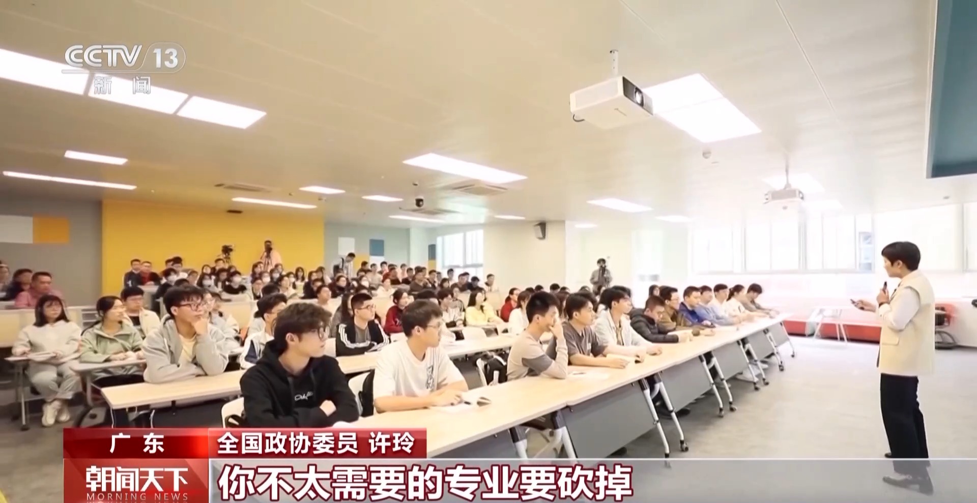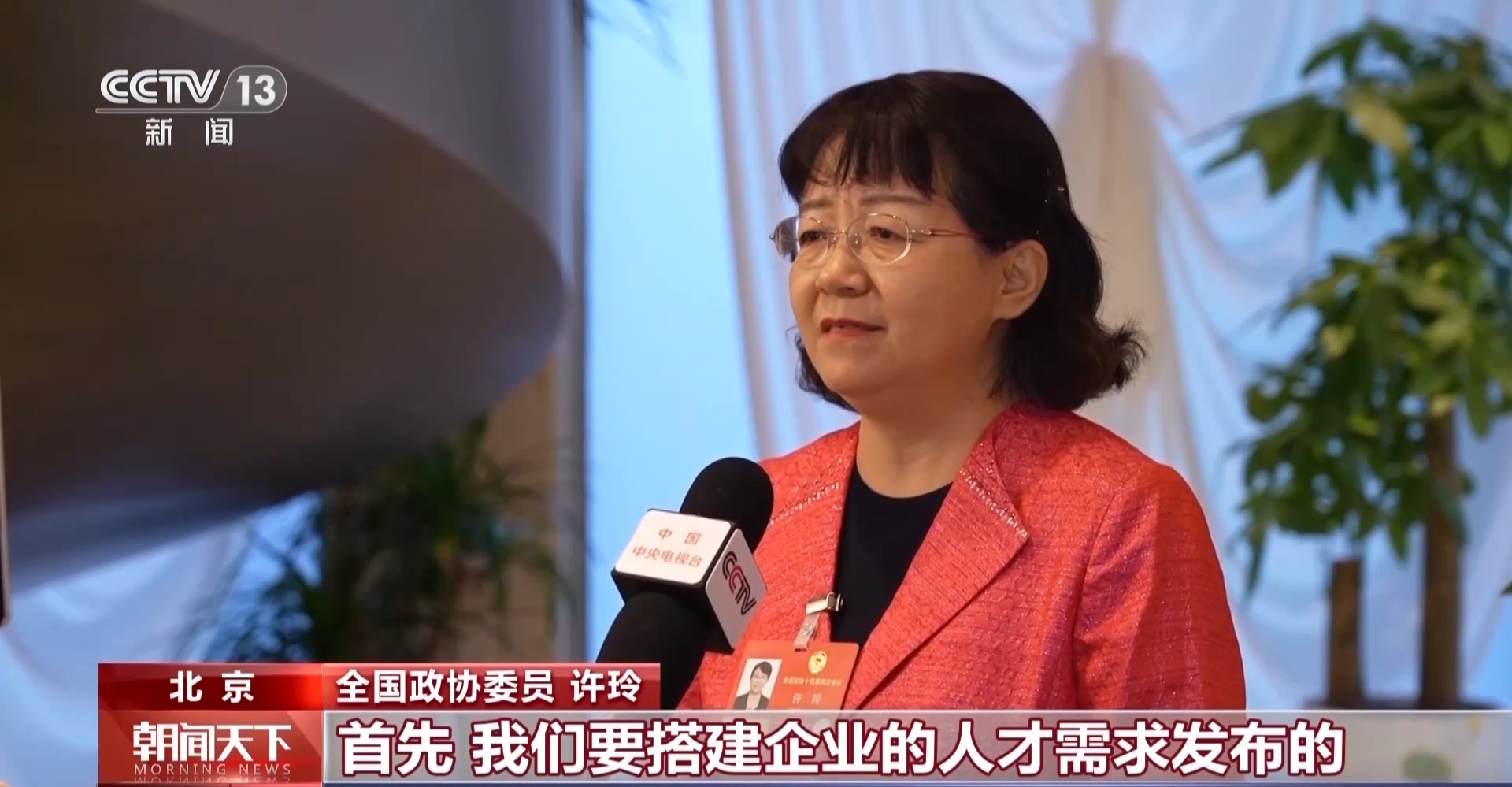 全国政协委员 许玲:去年两会,总书记说,人才有一个供需关系的变化,教育要想在前头,赶在前头。现在我们必须探索一条产业升级与人才培养相互促进的新路子。首先我们要搭建企业人才需求发布平台和制度,同时,高校也要进一步深化校企深度融合。还有建议各地方要筹建职业教育未来教师的学院,强化教师对产业的理解能力,提升数字素养和人机协同能力,增强跨学科、跨专业的整合和项目化的课程设计能力。我们要更加注重学生的综合能力,培养综合型、复合型的人才。