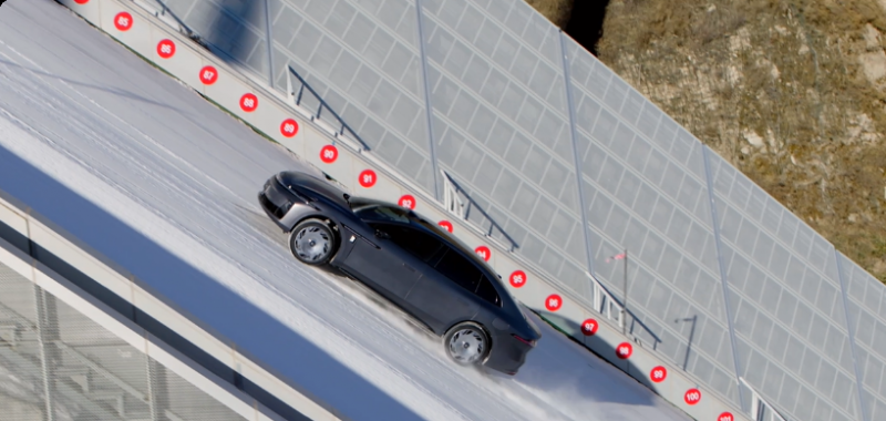 85米垂直落差、125米坡长、37.1度最大坡度,在国家跳台滑雪中心“雪如意”,昊铂A800克服冰雪湿滑、陡坡等多重极端条件,完成了行业首个双人冲坡挑战——双人驾乘带来的负重增加与重心动态变化,进一步提升了冲坡难度,而昊铂 A800 仍稳健登顶 “雪如意”,展现出超强的底盘实力。