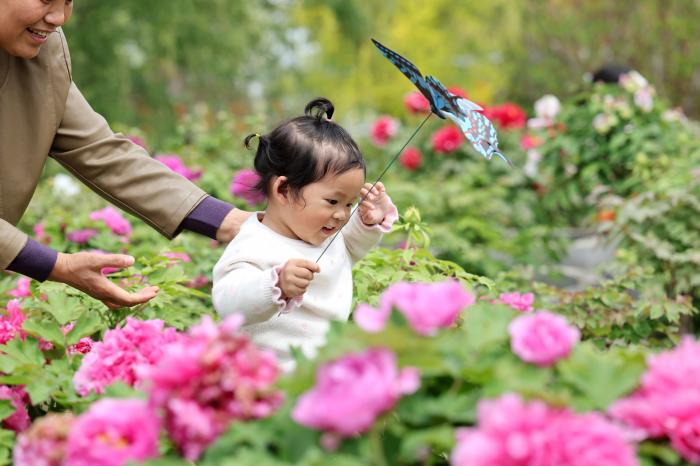 4月11日,小朋友在江苏省淮安市洪泽区西顺河牡丹园内游玩。新华社发(殷潮摄)