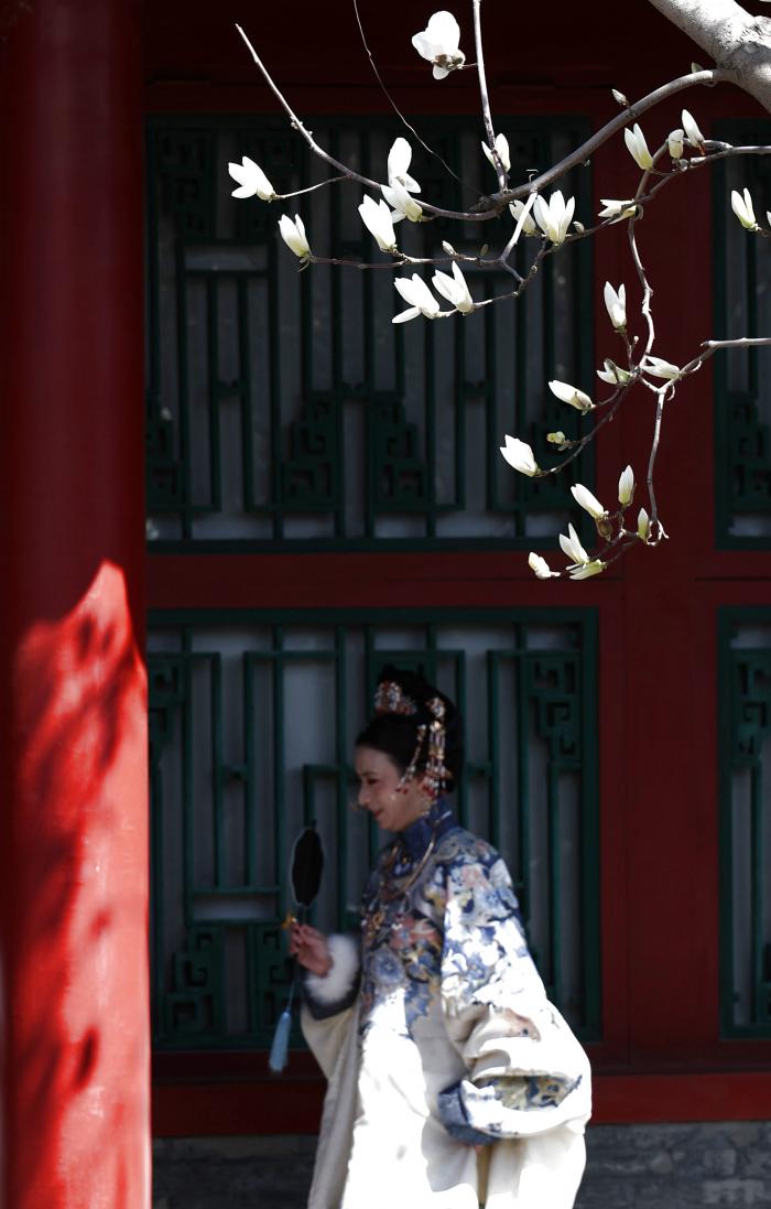 4月11日,游客在沈阳故宫赏花拍照。新华社记者 李钢 摄
